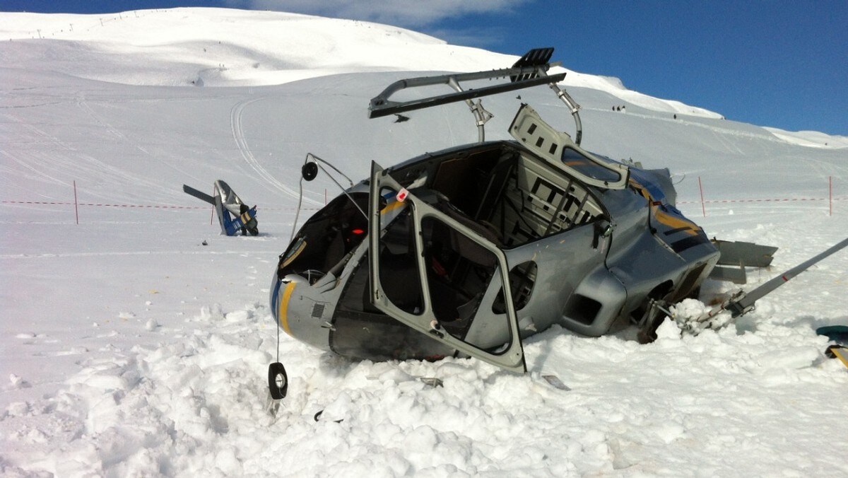 STYRTA MED FEM OM BORD: Halepartiet til helikopteret som styrta ved Røldal skisenter i fjor vart riven av i styrten. Alle dei fem personane i helikopteret overlevde.