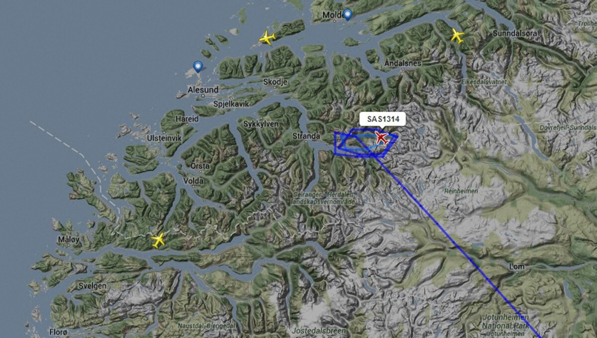 Her har Oslo-flyet mistet kontakten med flyplassen på Vigra. Dette flyet kretset over Tafjord/Valldal i ett kvarter. Den gule flymarkeringen ved Nordfjorden er Bergens-flyet som også venter i forbindelse med sambandsbruddet.