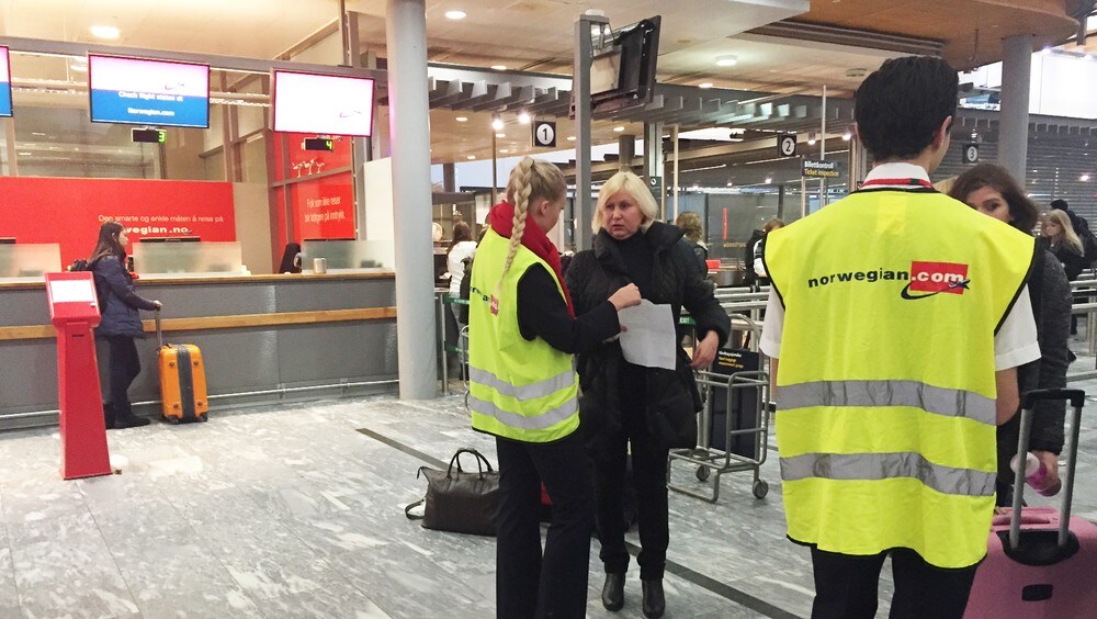 EKSTRA MANNSKAP: Streikfaste passasjerer får veiledning hos Norwegian-ansatte i gule vester på Oslo lufthavn onsdag morgen.