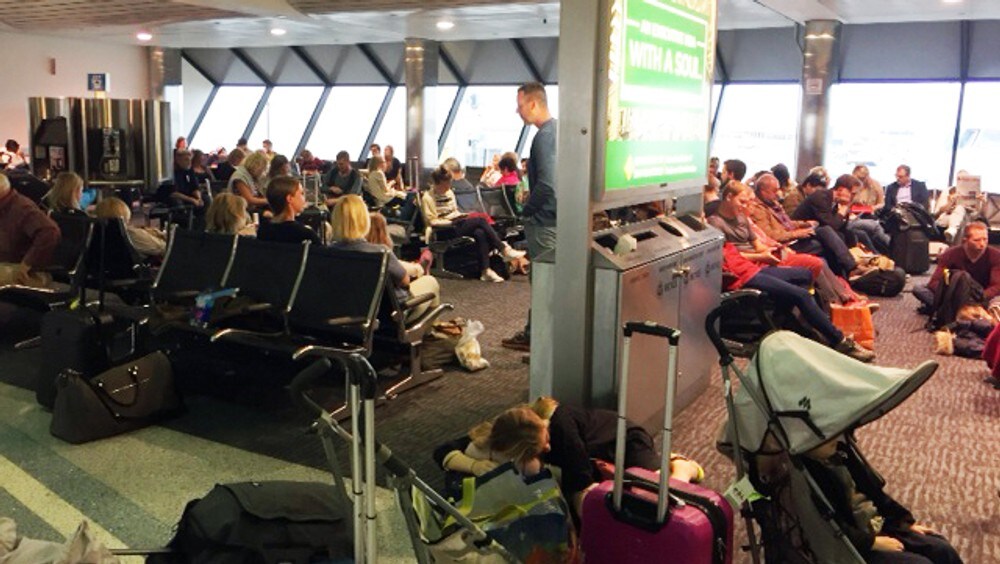 Mathisen fortel at det rådde ei fortvilt stemning over passasjerane som sat i avgangshallen og venta. – Vi har vel fått 6–7 meldingar på mobilen om ulike tidspunkt hittil. I dag hadde vi faktisk eit håp sidan vi fekk eit erstatningsfly. Så kom dette på tampen av alt. Det er nærast opprørsstemning.