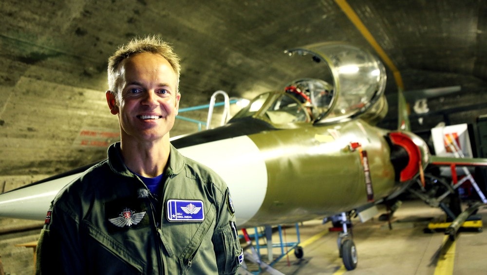 Jagerflypilot Eskil Amdal er plukket ut til å sitte bak spakene, når Starfighter igjen skal ut å fly igjen. Her er han foran flyet han skal ta opp i lufta.