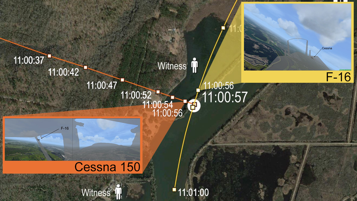 Within the public docket, a 100-page report details a painstaking study and digital recreation of what each pilot could have seen as the aircraft closed the distance between them in the final minute before the collision. A reconstruction built from available information including radar records and data recorded by the F-16 illustrates how easily a wing strut or instrument panel can hide another aircraft from sight, even at close range.
