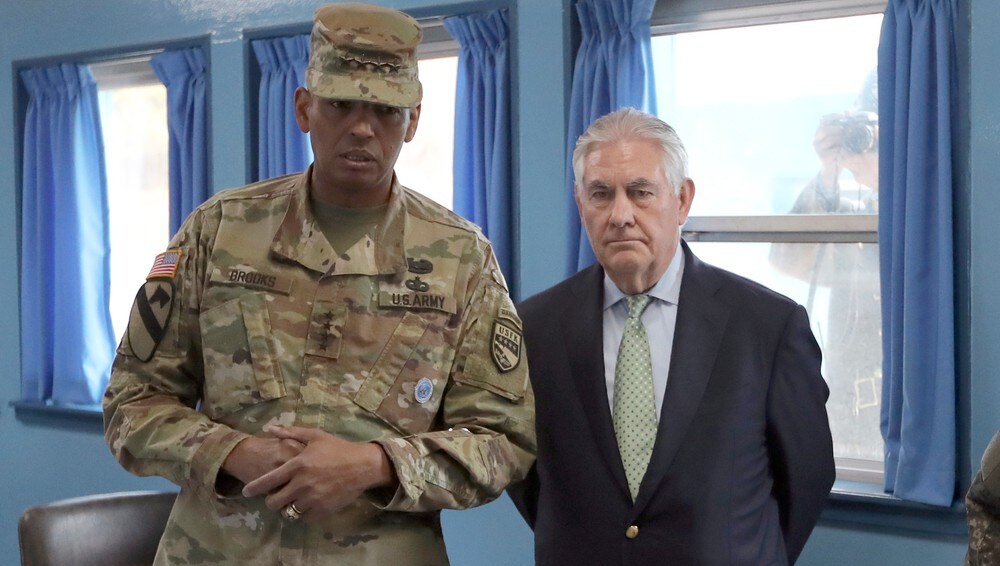 På sitt besøk i den demilitariserte sonen sa Tillerson at det kan bli aktuelt å gripe inn militært overfor Kim Jong-un.