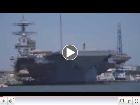 The Gerald R. Ford is maneuvered by tug boats in the James River