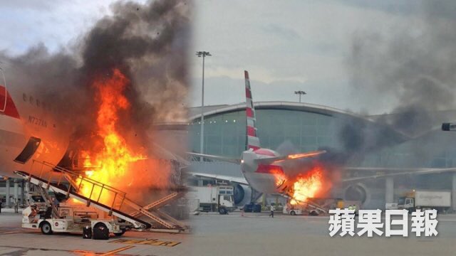 ![]() An American Airlines Boeing 777 was damaged Monday evening at Hong Kong Airport when either luggage or cargo being loaded on the aircraft caught fire. The fire occurred just as a container was being put in the aft cargo hold. Video from the scene shows a ramp worker falling from the hold and being helped away by coworkers. No passengers or flight crew were on the aircraft, which was to have left for Los Angeles in the early evening. Early reports suggest an oil leak on the loading apparatus might be to blame for the fire. Passengers are being put on other flights to L.A. as the aircraft was clearly damaged by the fire, which was put out quickly by firefighters.