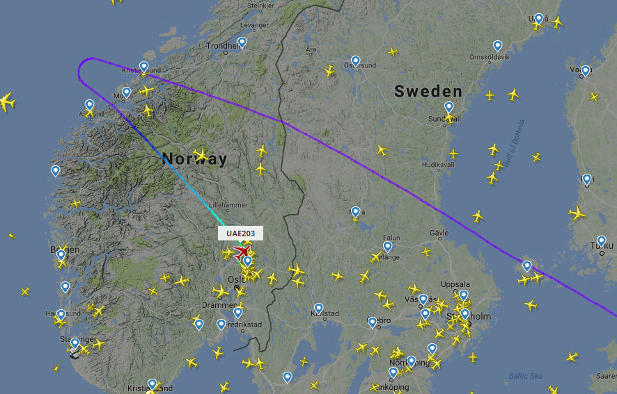 Her kan man se hvordan Emirates-flyet snudde og satte kursen mot Gardermoen for en såkalt medisinsk nødlanding.