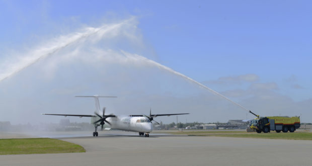 Billund Lufthavn kunne byde første Widerøe-fly velkommen til den vestdanske lufthavn med strålende sol og norske skillingsboller.