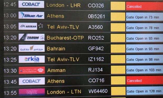 A departure board displays cancelled Cobalt flights at Larnaca airport, Cyprus. Photograph: Yasmine Canga-Valles/AFP/Getty Images