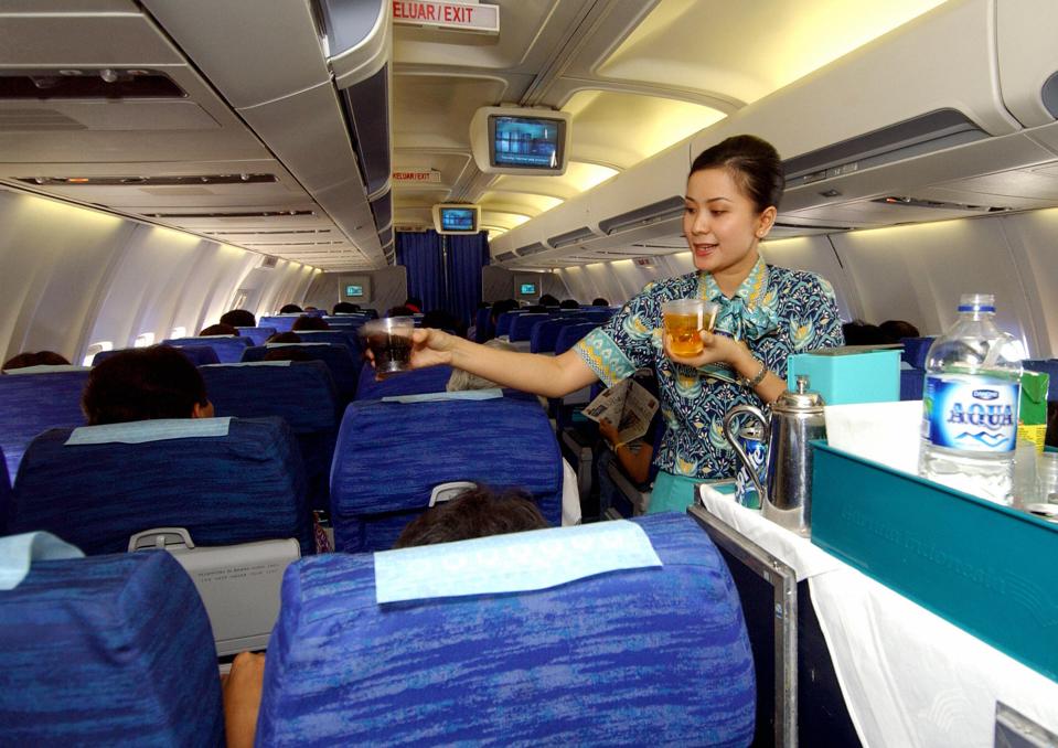 JAKARTA, INDONESIA: A stewardess serves passengers on Indonesian flag carrier Garuda Indonesia.