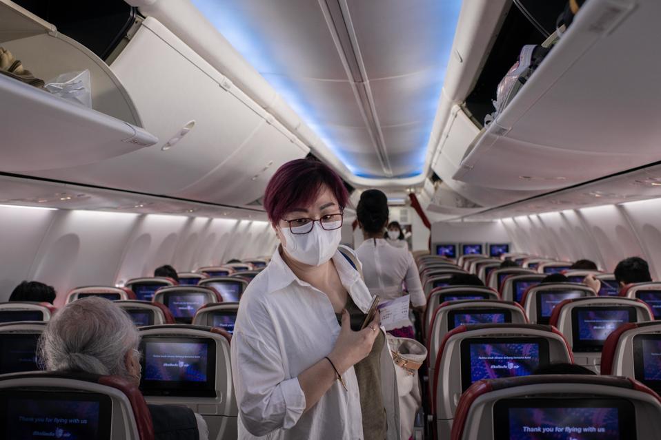A passenger wears surgical mask inside an airplane at the...