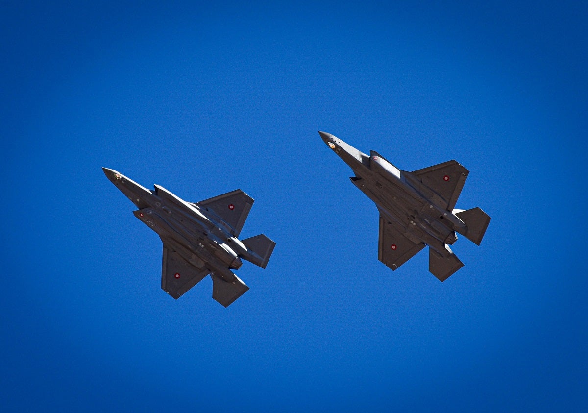 Two Royal Danish Air Force F-35A Lightning II fighter jets assigned to the 308th Fighter Squadron fly on April 13 over Luke AFB, Ariz.--the first two of seven RDAF F-35s to arrive at Luke AFB as Danish pilots prepare to begin the F-35 training program. Luke AFB trains allied fighter pilots from around the world (U.S. Air Force Photo)